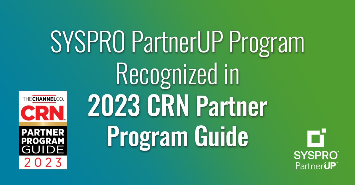 TUSTIN, Calif. – SYSPRO, a global provider of industry-built enterprise resource planning (ERP) software, today announced that CRN®, a brand of The Channel Company, recognized SYSPRO’s PartnerUP Program in its 2023 Partner Program Guide. This annual guide offers essential information to members of the IT channel ecosystem as they explore technology manufacturers’ partner programs to find the vendors that will best support their business needs.